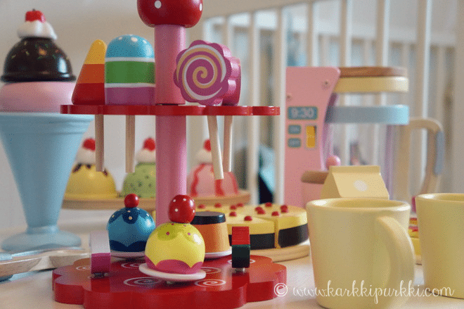 Aina välillä lastenhuoneen pöytä täyttyy herkuista. Kattaukseen kuuluu monen sortin tarjottavaa, ainakin tikkareita, jätskiä ja kahvia. Niin ja varsin tuoreitakin nämä on, siinä kahvikestien lomassa nimittäin pyöräytetään taikinakoneella lisää leivonnaista pöytään. Kahviakin keitellään useampaan otteeseen, joka mukiin lorautetaan kunnolla maitoa ja maustetaan vielä hyppysellisellä sokeria.