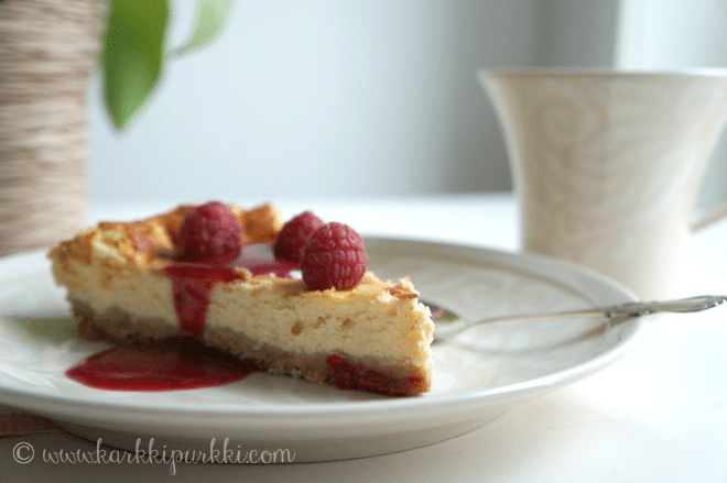 Murenna keksit ja sekoita sulatetun von kanssa. Painele seos voidellun irtopohjavuuan pohjalle, nosta kylmään odottamaan. Sekoita täytteen ainekset, paitsi munat, kulhossa. Riko nyt munat yksitellen ja vatkaa tasaiseksi. Levitä täyte vuokaan pohjan päälle, paista 175 asteisessa uunissa n. 45 minuttia. Anna jäähtyä huoneenlämmössä ja nosta sitten kylmään. Kakku on hyvä tehdä valmiiksi edellisenä päivänä, sillä se on parasta seuraavana päivänä. Tarjoile vadelmakastikkeen ja tuoreiden vadelmien kanssa!